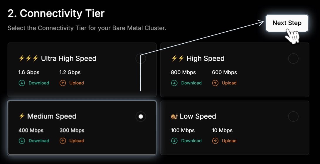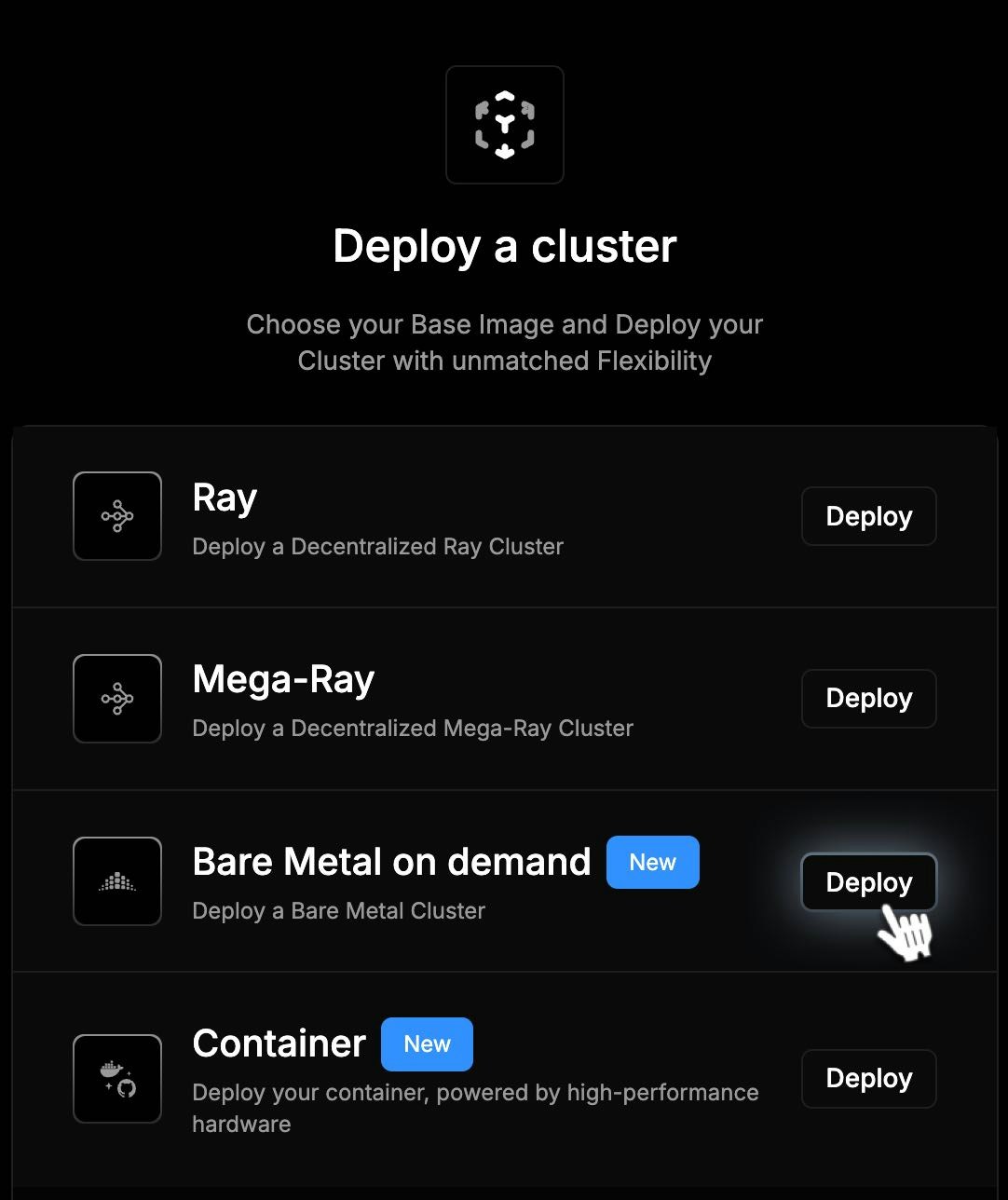 sudo or root access. Certain system-level operations requiring elevated privileges will not be possible. Please ensure your workloads and deployment requirements can operate within this restriction.To deploy a Bare Metal On Demand Cluster: