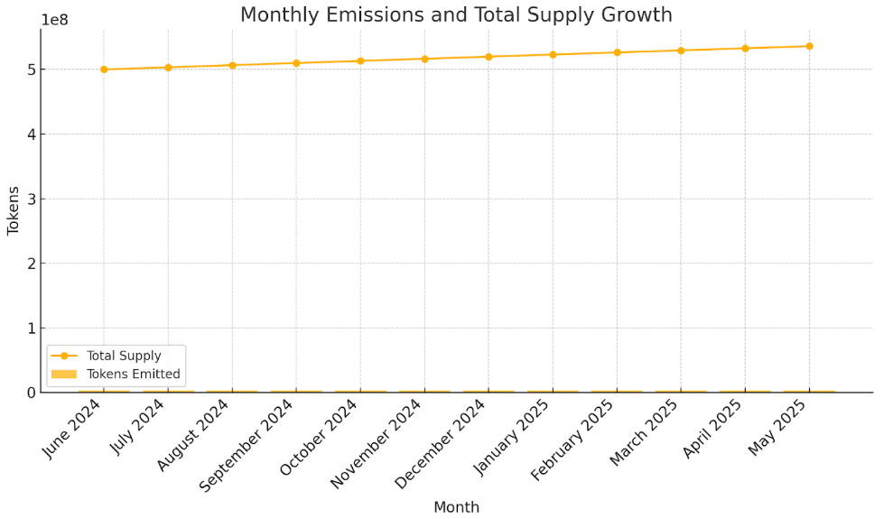 Below is a chart illustrating the total supply growth and token emissions for the first 12 months: