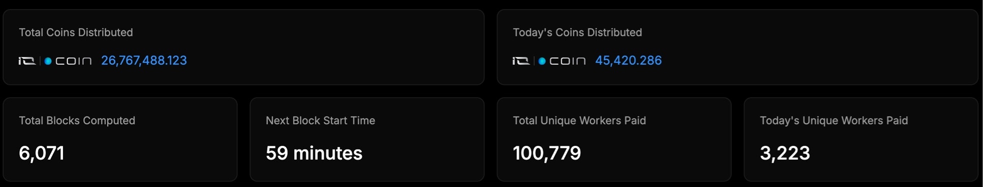 - Total Unique Workers Paid: Represents the total number of distinct workers that have received $IO coin rewards since the network began distributing payments.