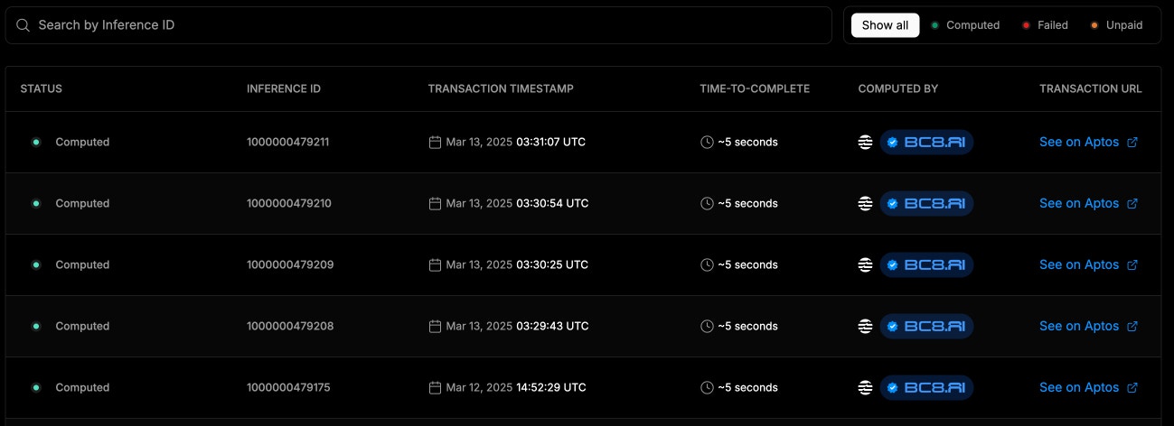 The Inferences Table offers a transparent, real-time view of transactions conducted on the network. The table includes:- Transaction Status (successful, pending, or failed)
