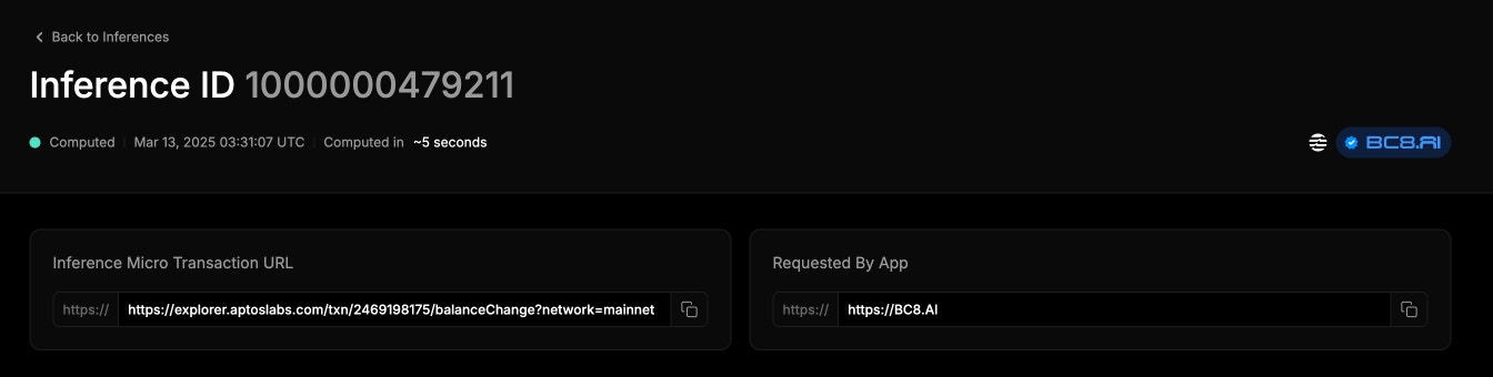 - Inference Micro Transaction URL (on-chain transaction record)
