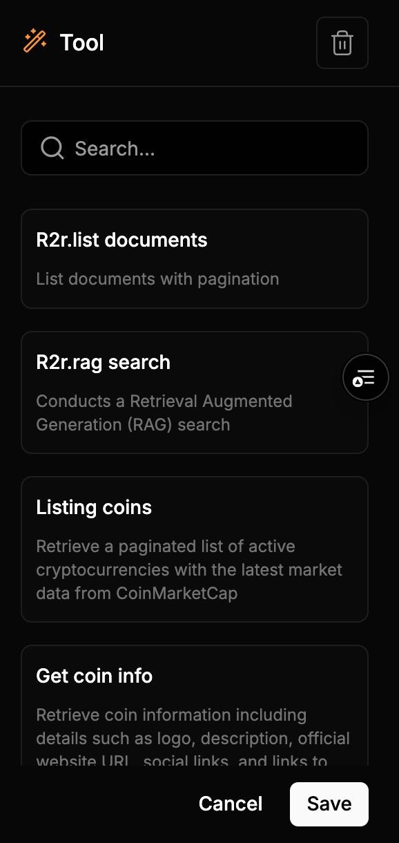 Use Tool components to integrate external capabilities — such as RAG search, cryptocurrency data, or web search. Tools allow Agents or Tasks to interact with these systems. To use a Tool:- Add the Tool component to your flow.