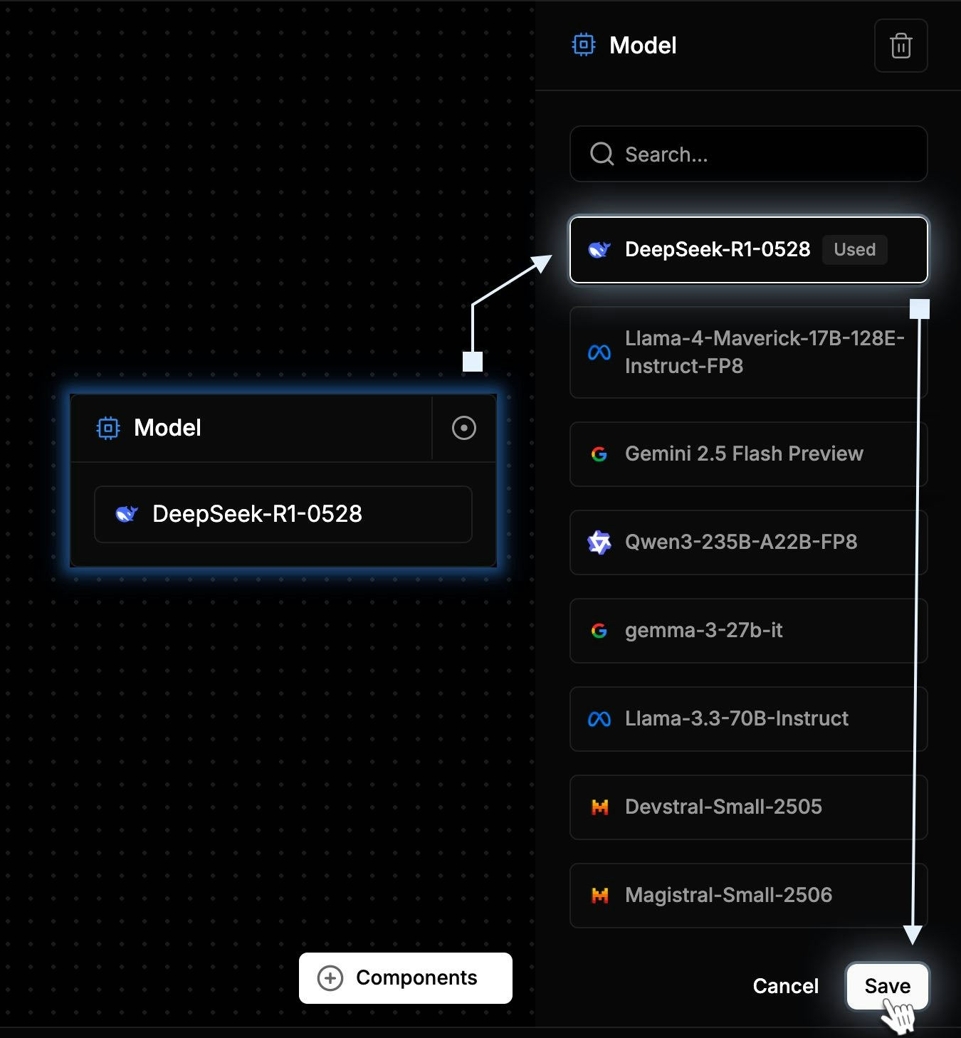Attach an AI Model to the Agent by clicking into the component and choosing from the available models in the right sidebar. This defines the core reasoning engine your agent will use.- Click Add Component → Select AI Model