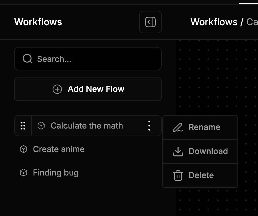 - Flow List Displays all your existing workflows, grouped by folders. Each flow entry shows the number of components inside it, e.g. (2).