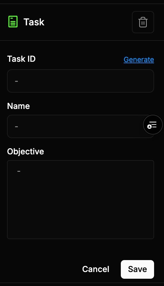 Add Task components for specific steps your Agent will perform. Configure each task with:Task ID, Name, Text, Client Mode (on/off)