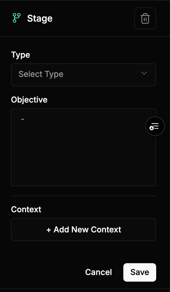 Add Stage components to organize your workflow into sequential or parallel stages, each with defined objectives and context. Configure each Stage with:Type, Objective, Result Type, Context