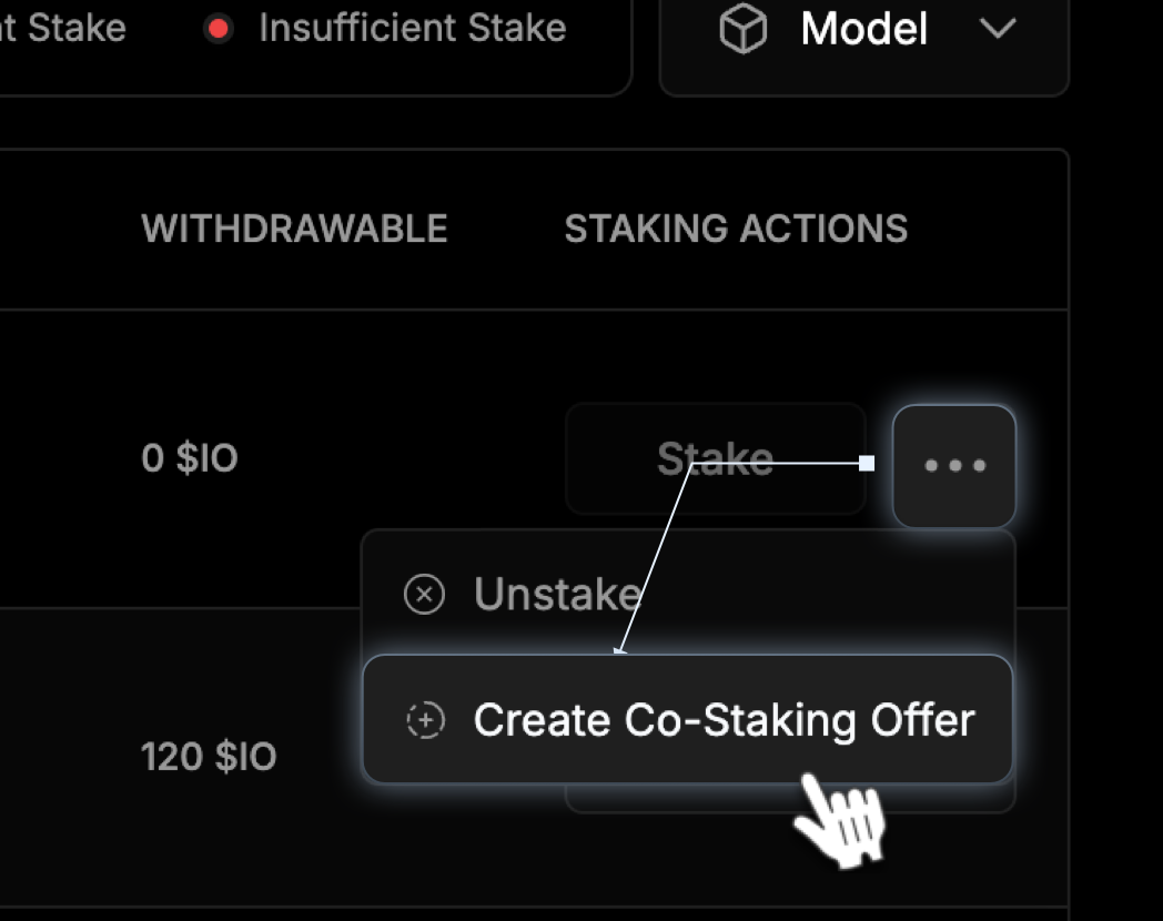 In the Staking Actions column, click the three dots next to your device and select Create Co-Staking Offer.