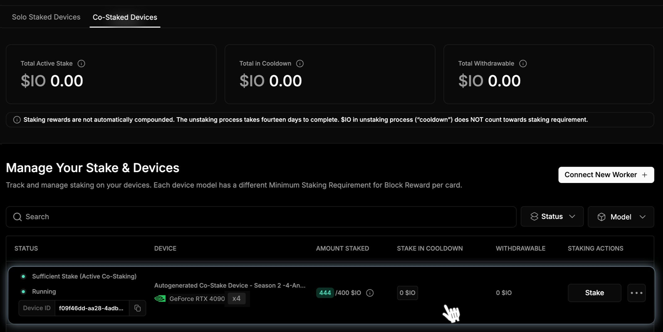 - Insufficient Stake (Waiting for Co-Staker): The device does not meet the minimum stake requirement and is waiting for a co-staker to fulfill it.