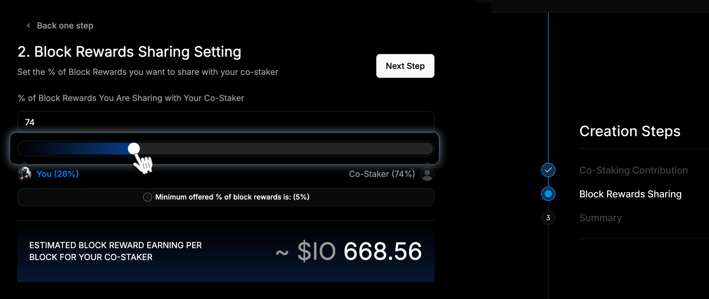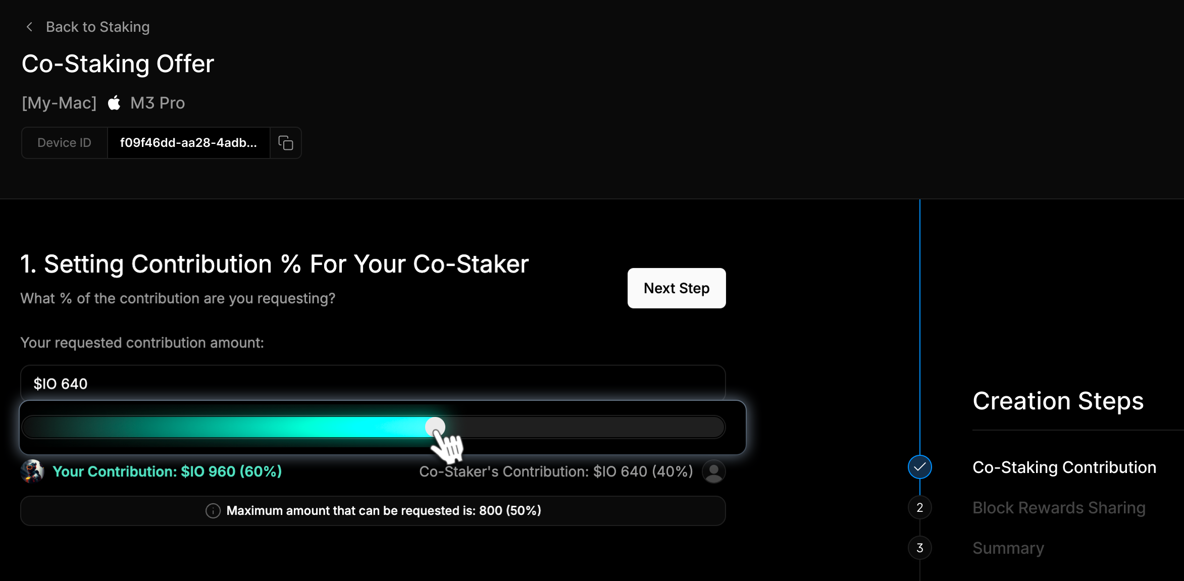 Set the amount of IO you’re requesting from a potential co-staker using the slider on the Co-Staker Contribution page. The maximum co-stake is 50% of the total stake.