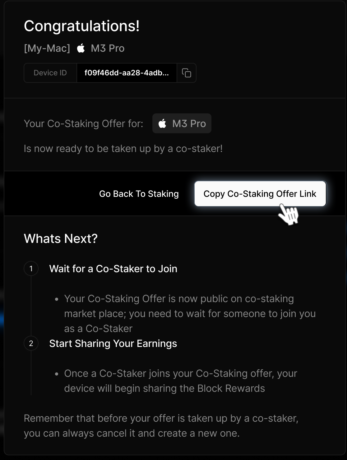 To see your device, return to the Staking section and find your device listed under the Co-Staking Devices tab.