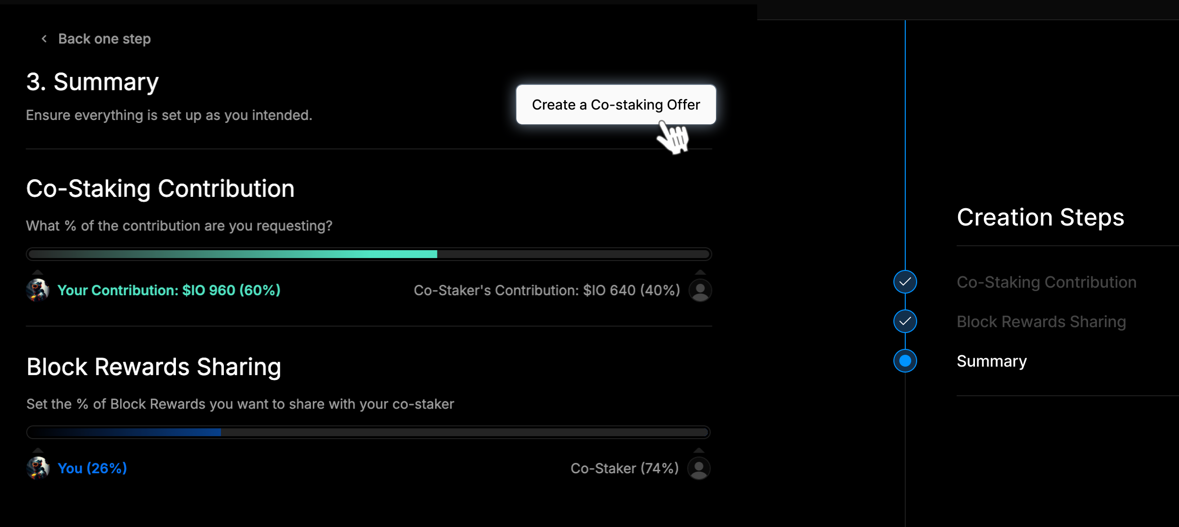 Review your choices on the Summary page and click Create a Co-Staking Offer.