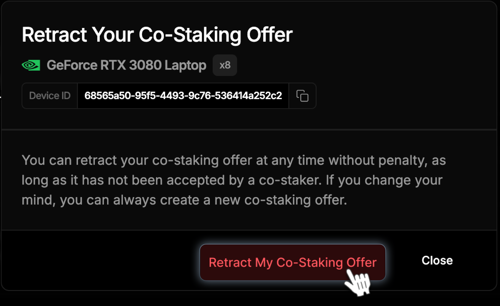 In the pop-up, confirm by clicking the Retract My Co-Staking Offer button to complete the process.