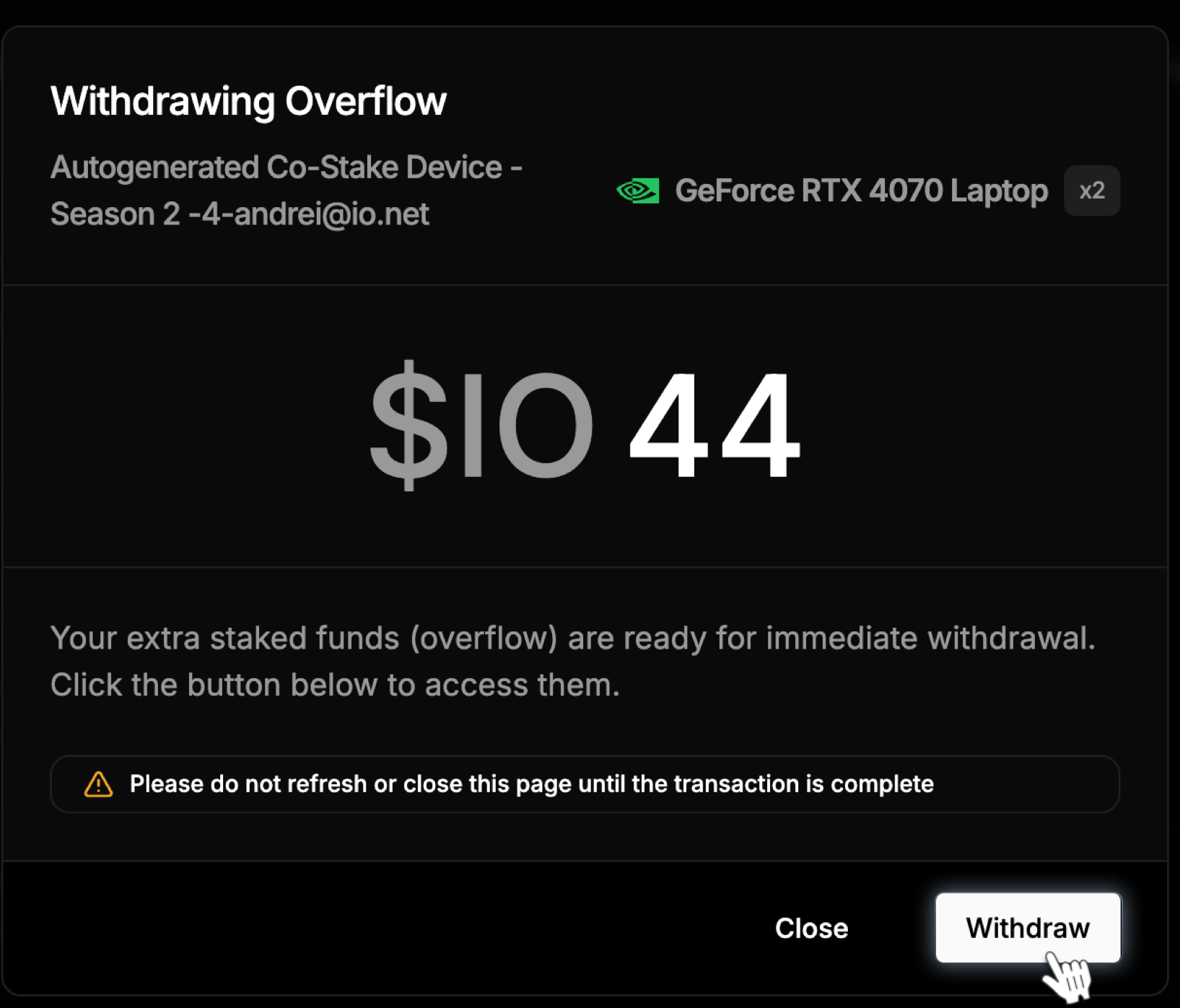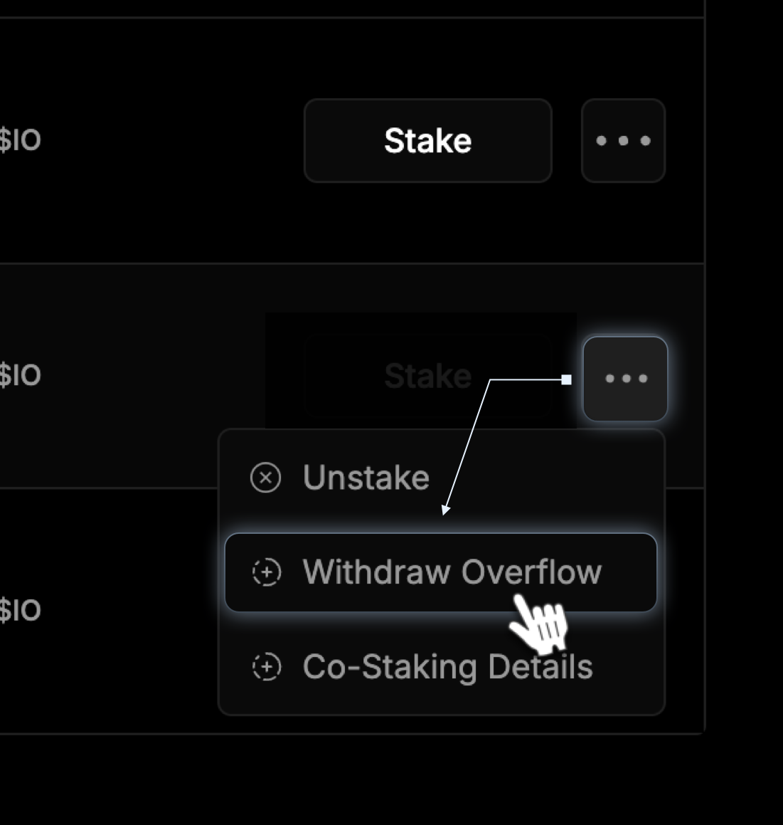 Overflow refers to funds exceeding your initial stake that can be withdrawn separately, while your original stake remains locked until the unstaking process is complete. How to Withdraw Overflow:- Go to the Manage Your Stake & Devices section and select the Co-Staked Devices tab.
