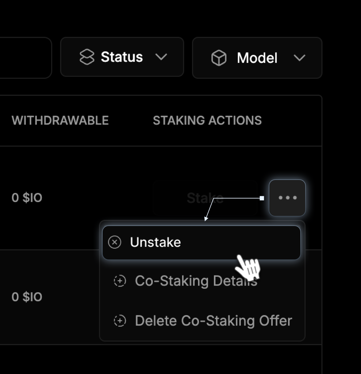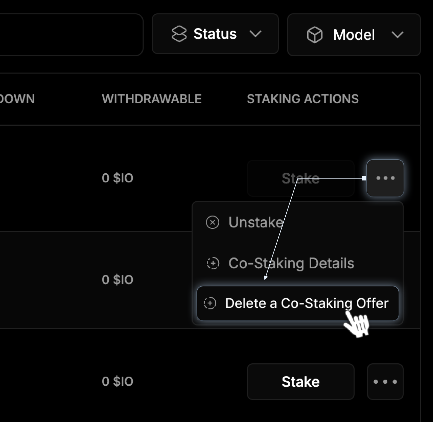 - Go to the Manage Your Stake & Devices block, where all your staking devices are listed, and click the three dots next to the desired device.