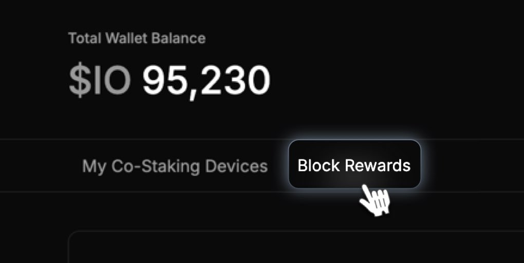 To view your co-staked devices and earnings, go to IO Staking> My Co-Staking Devices > Block Rewards tab.