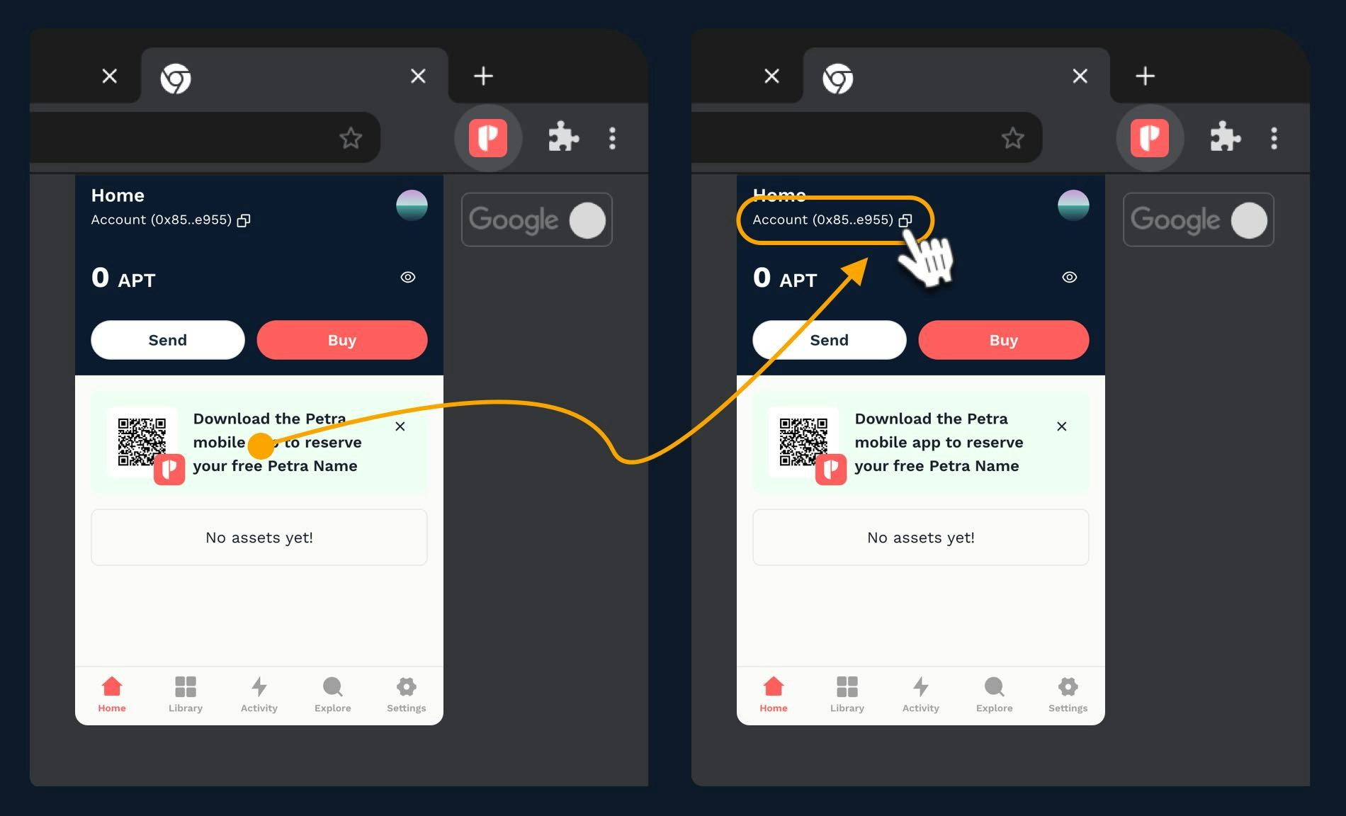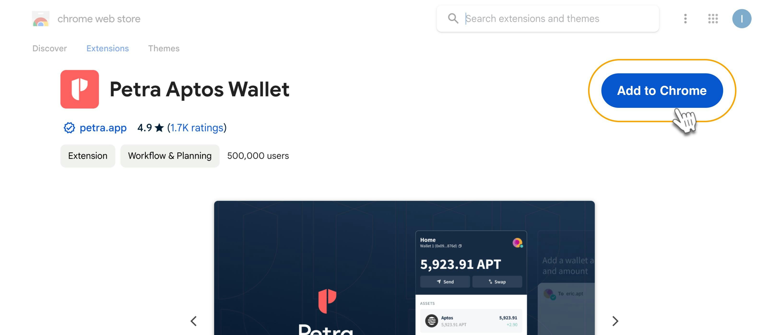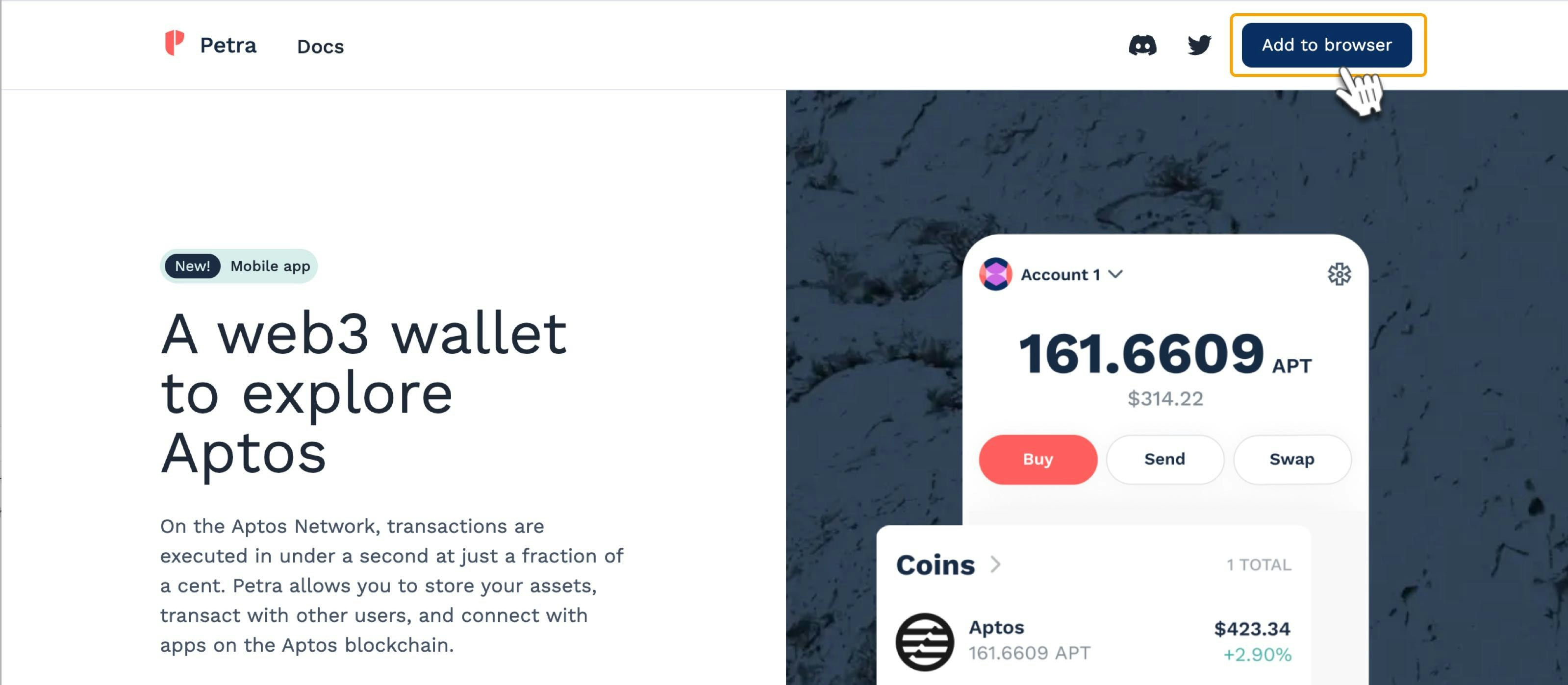 You can create any Aptos (APT) wallet from the official list here: Aptos Ecosystem. For this example, we will use a popular option - Petra, and demonstrate how to configure and use the wallet: 1. Go to Petra Wallet.- Select the browser to install Petra on. In this example, we use Chrome.