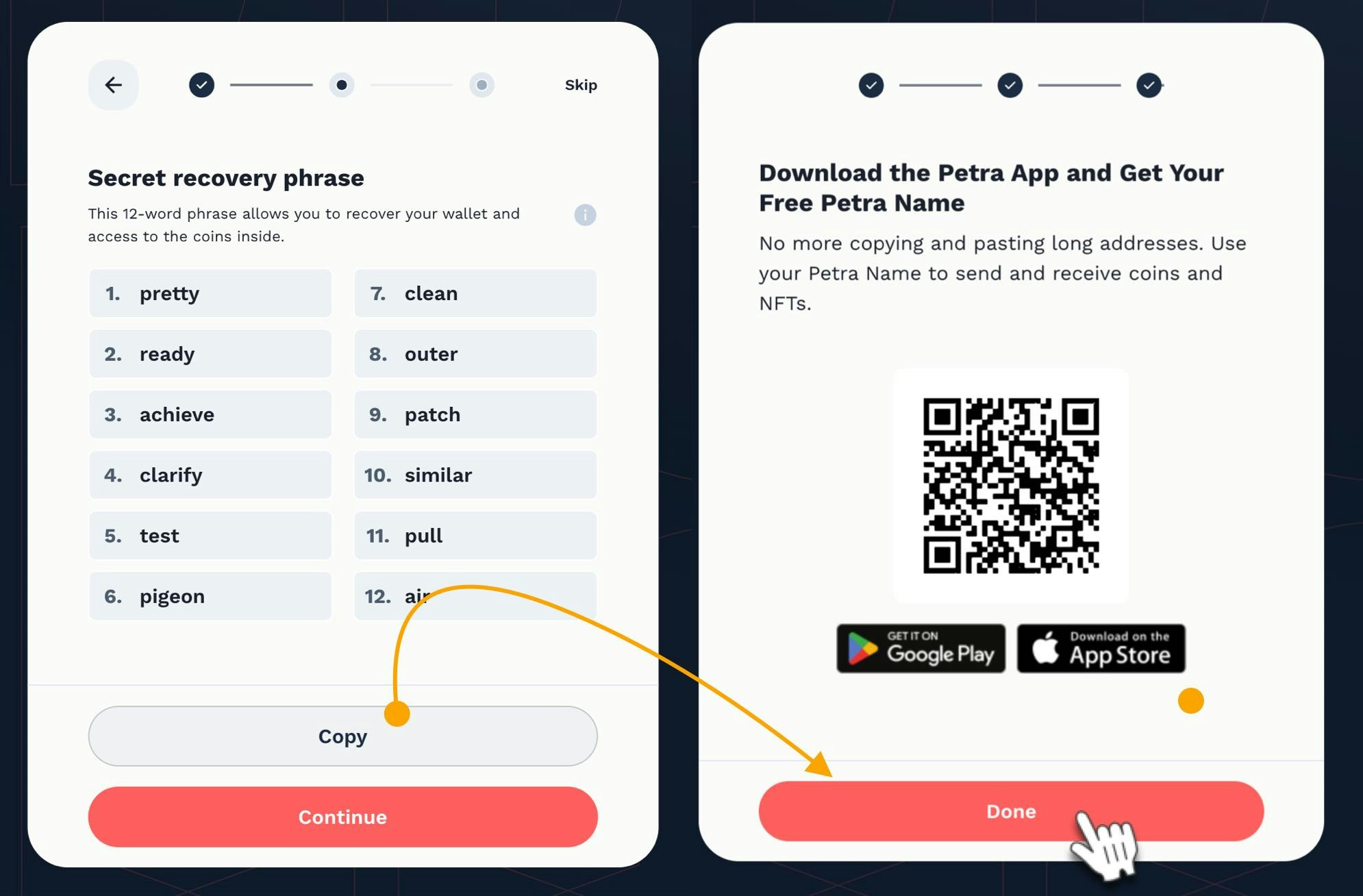 - In the Secret Recovery Phrase page, copy and store your 12 word Secret Recovery phrase. You can save them on password managers like Keepass.