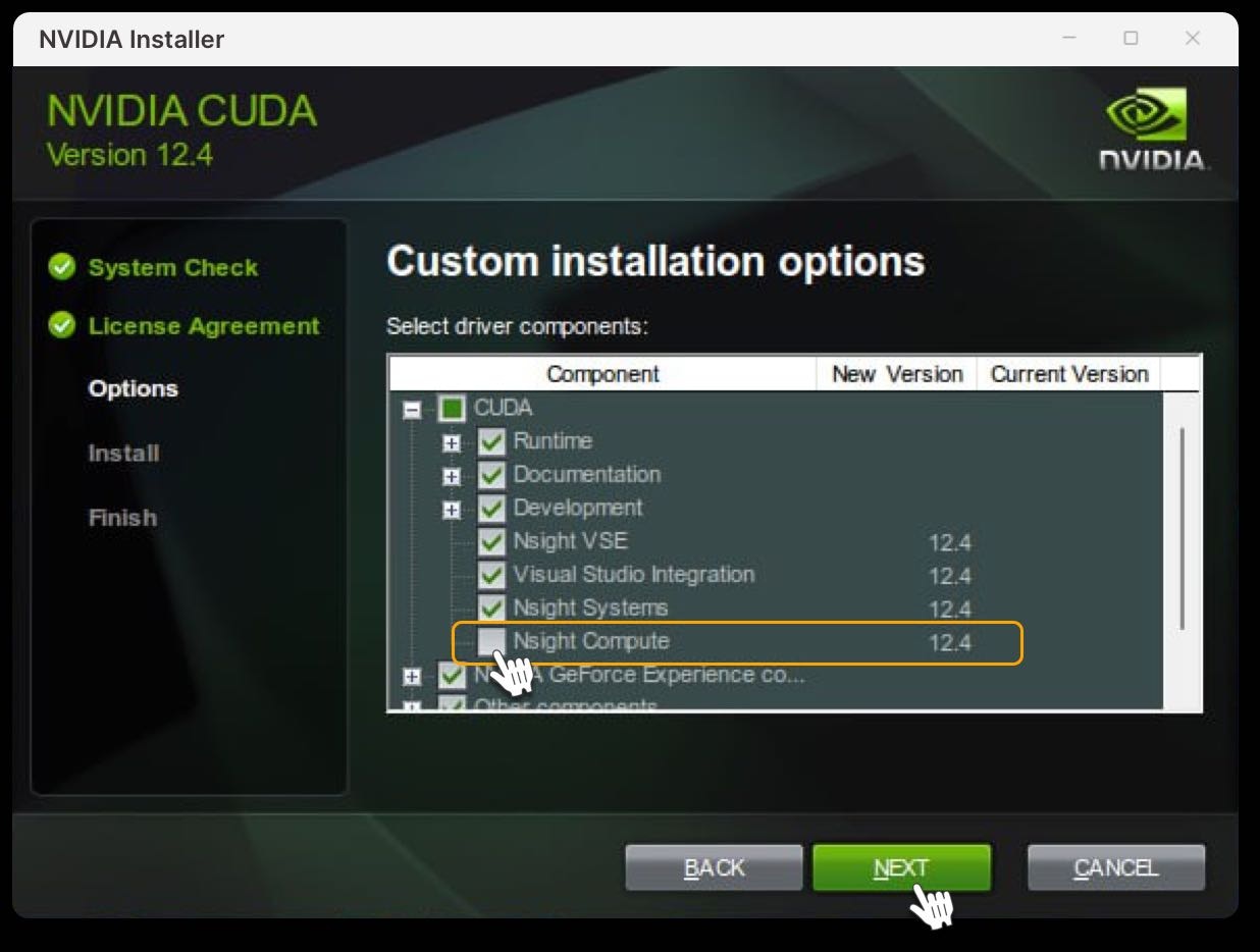 After selecting the custom installation option, expand the CUDA section and uncheck the option for Nsight Compute to exclude it from the installation. This step ensures that only the necessary components are installed, reducing the likelihood of errors.
