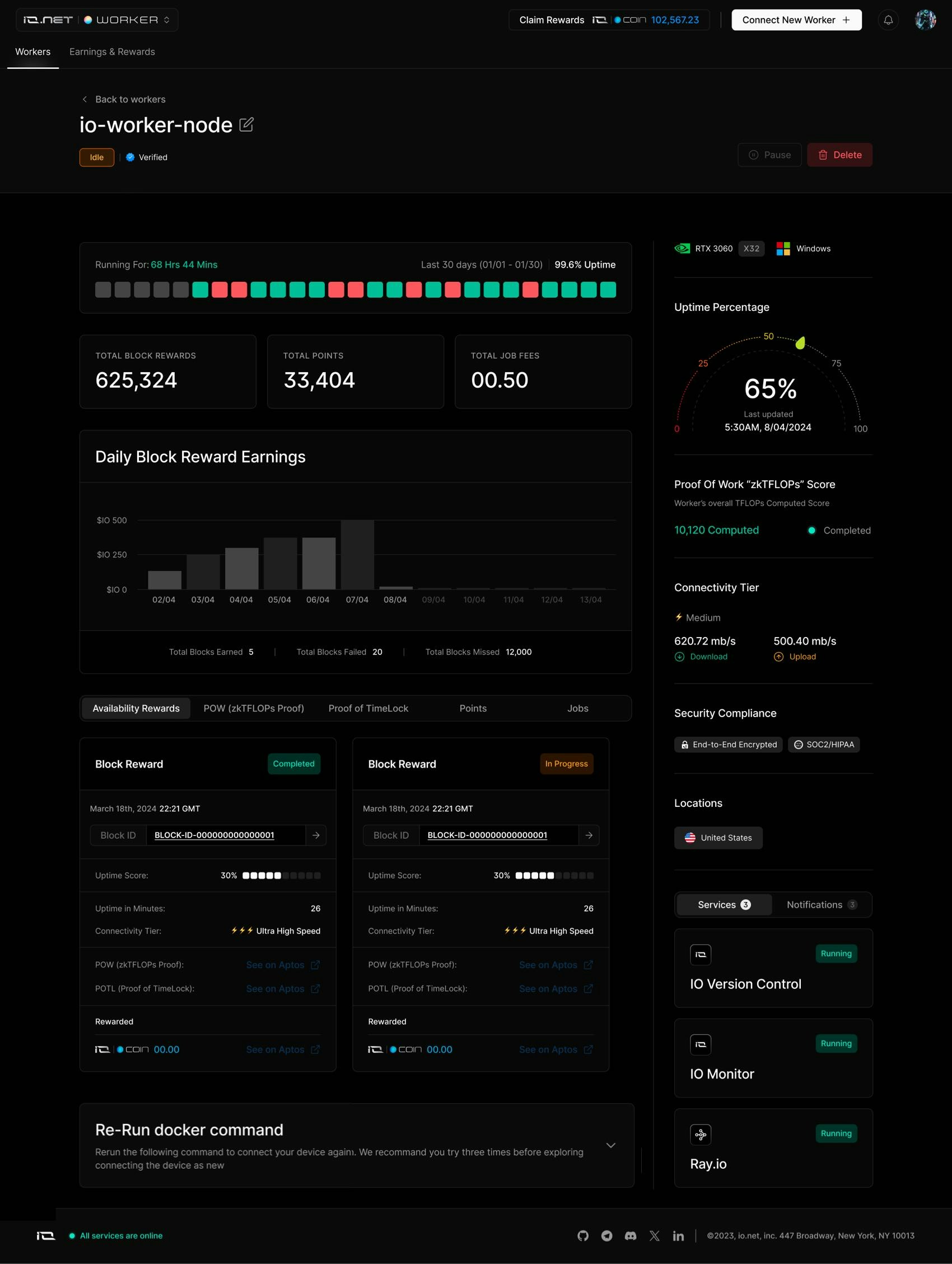 The Device View page provides a comprehensive overview of the device’s details. io.net presents real-time data on transmitted traffic, connection status, and uptime history. Users can monitor the status of all active services on the device and activate additional ones by purchasing io.coins. By default, these services are automatically linked to the worker:- IO Version Control