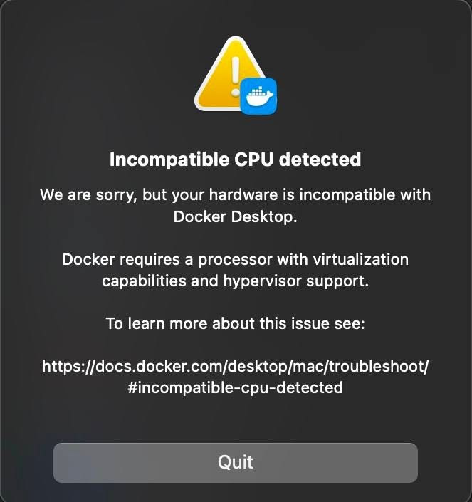 To resolve this issue, ensure you download and install the appropriate Docker version. For macOS, Docker provides two options: “Apple Chip” and “Intel Chip.”