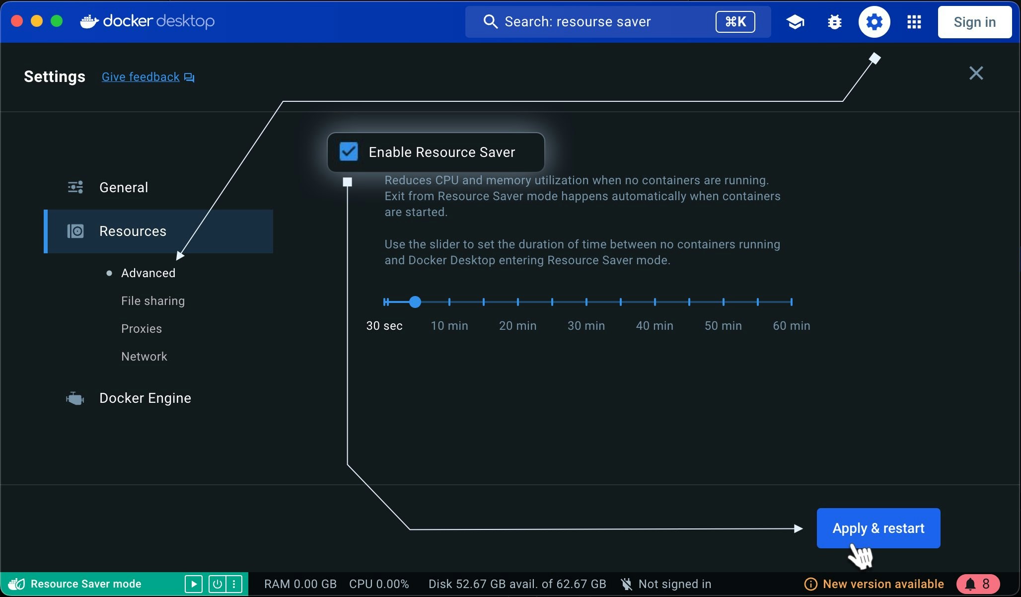 Ensure resources aren’t limited. Make sure Docker’s “Resource Saver” feature is disabled in the Resources tab of Docker Settings.