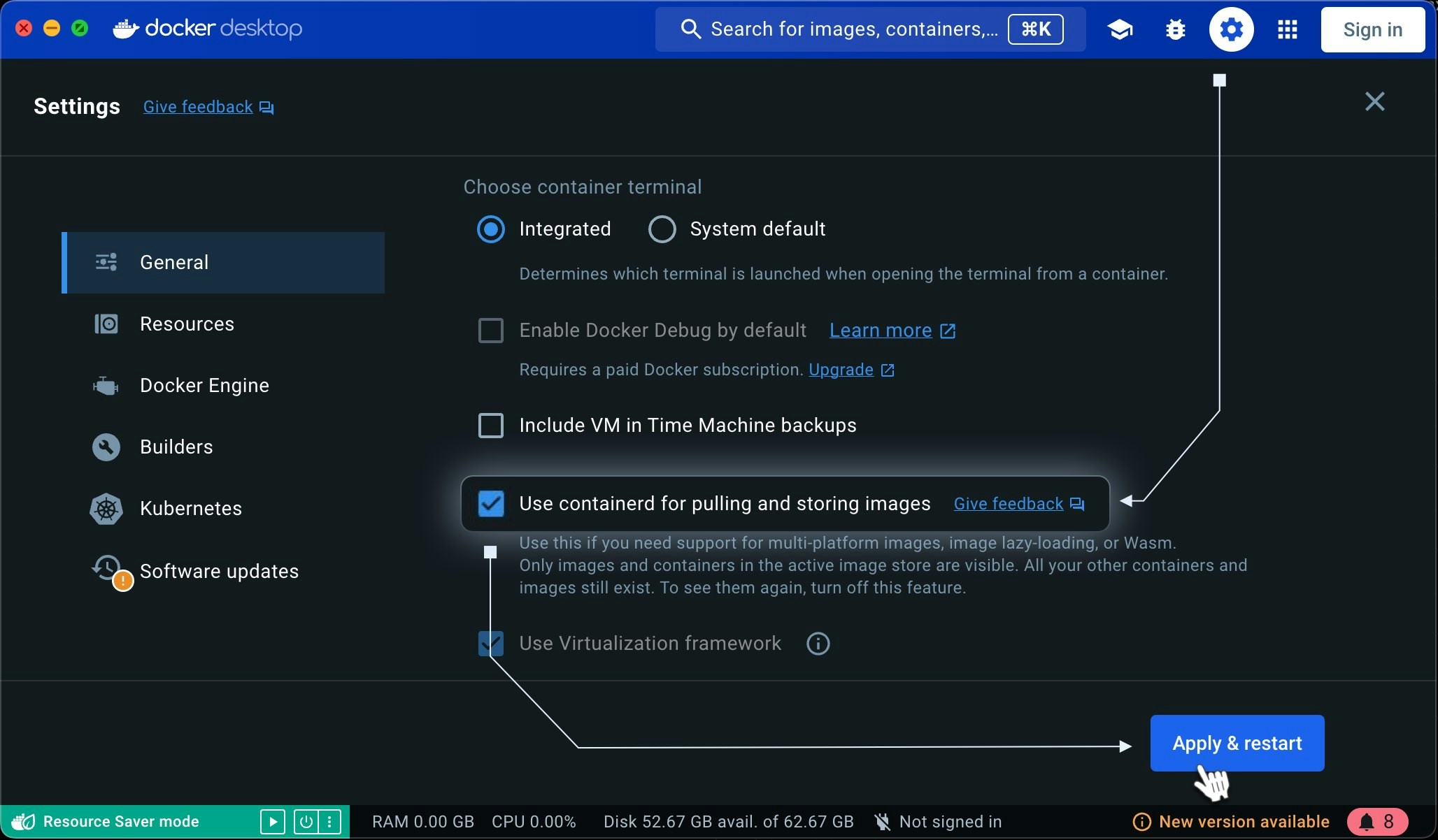 Ensure the “Use containerd for storing and pulling images” option is disabled in Docker’s General Settings.