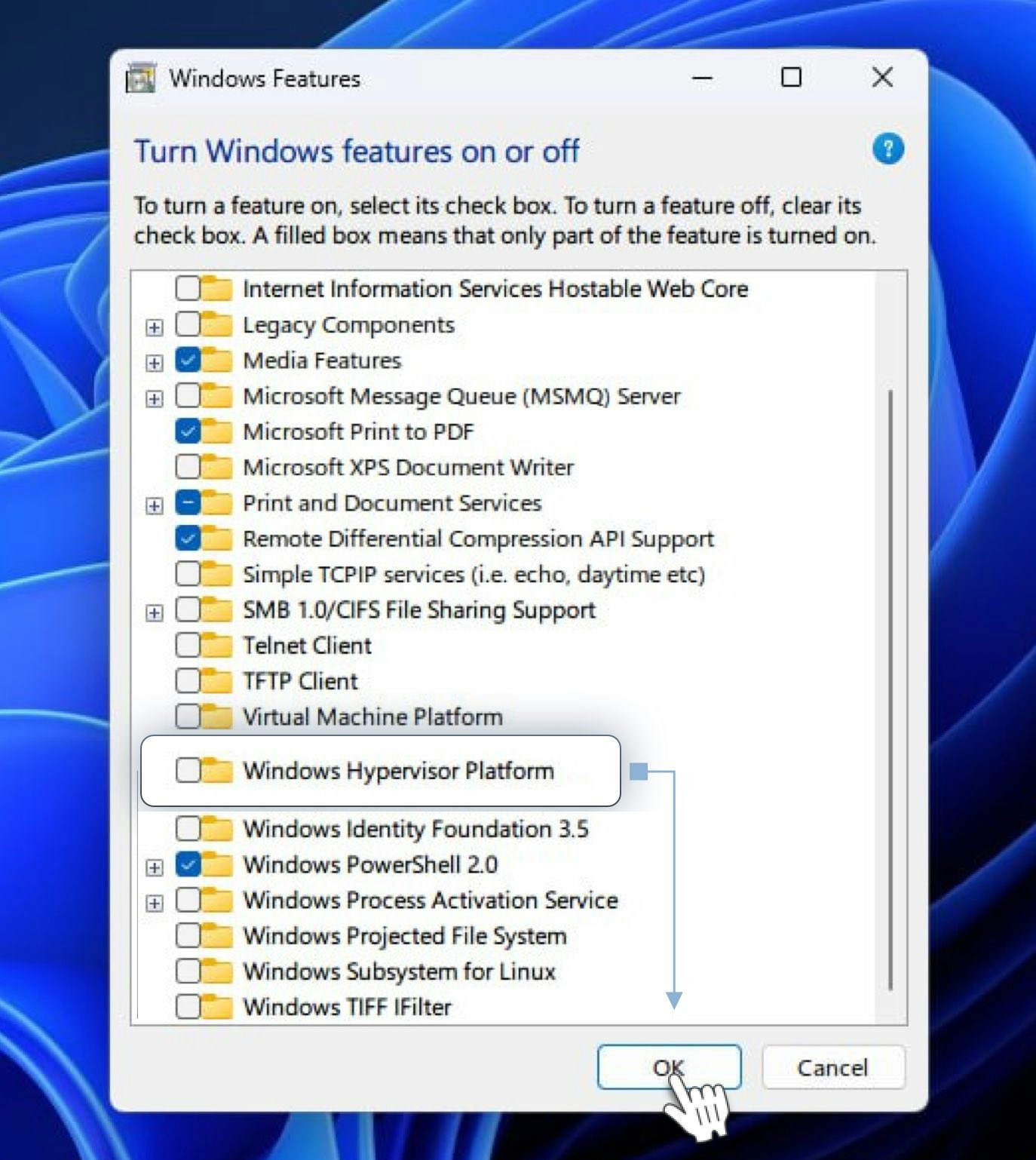 In the Windows Features dialog, scroll down and check Windows Hypervisor Platform, then click OK.: