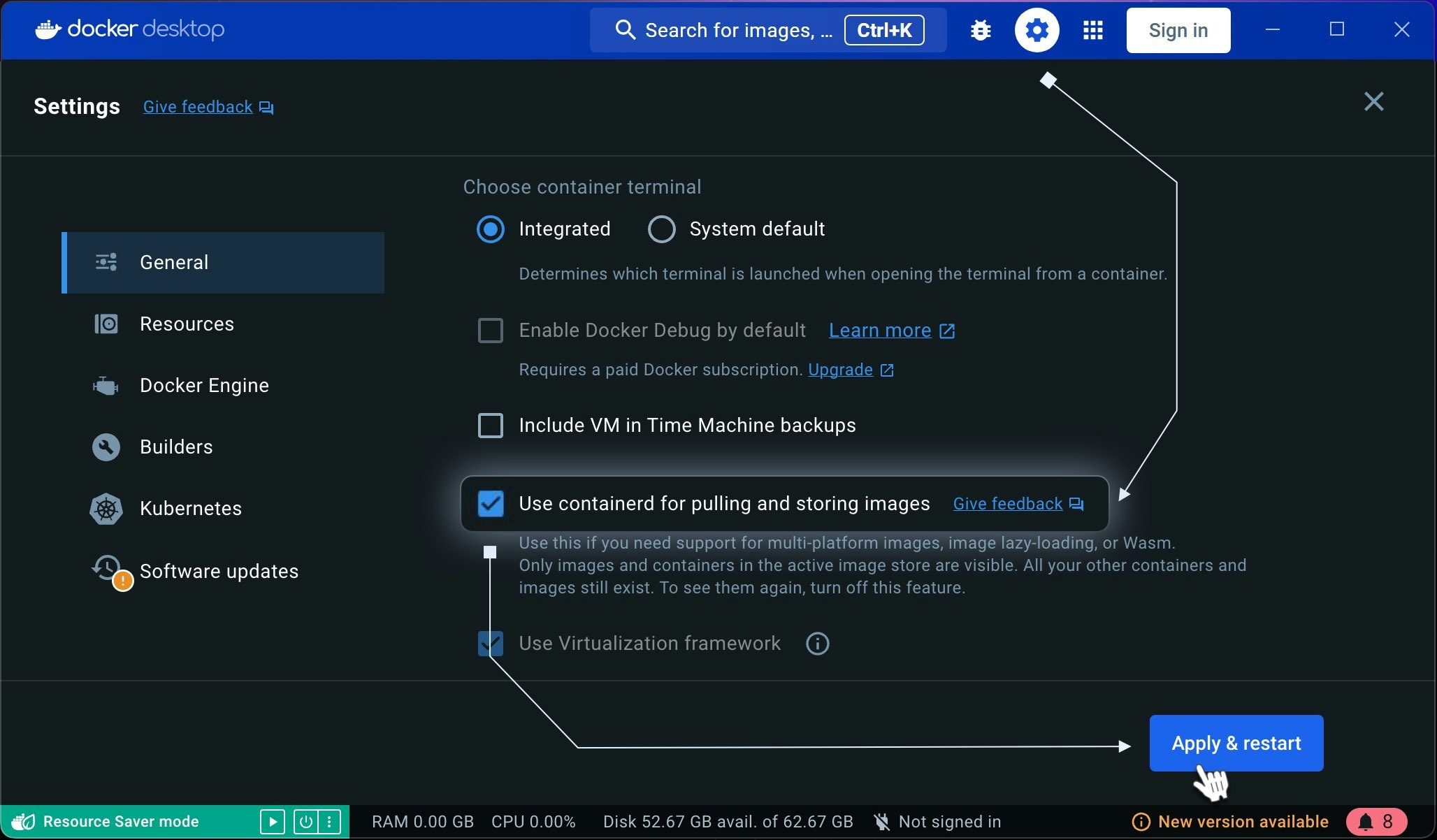 Ensure the “Use containerd for storing and pulling images” option is disabled in Docker’s General Settings.