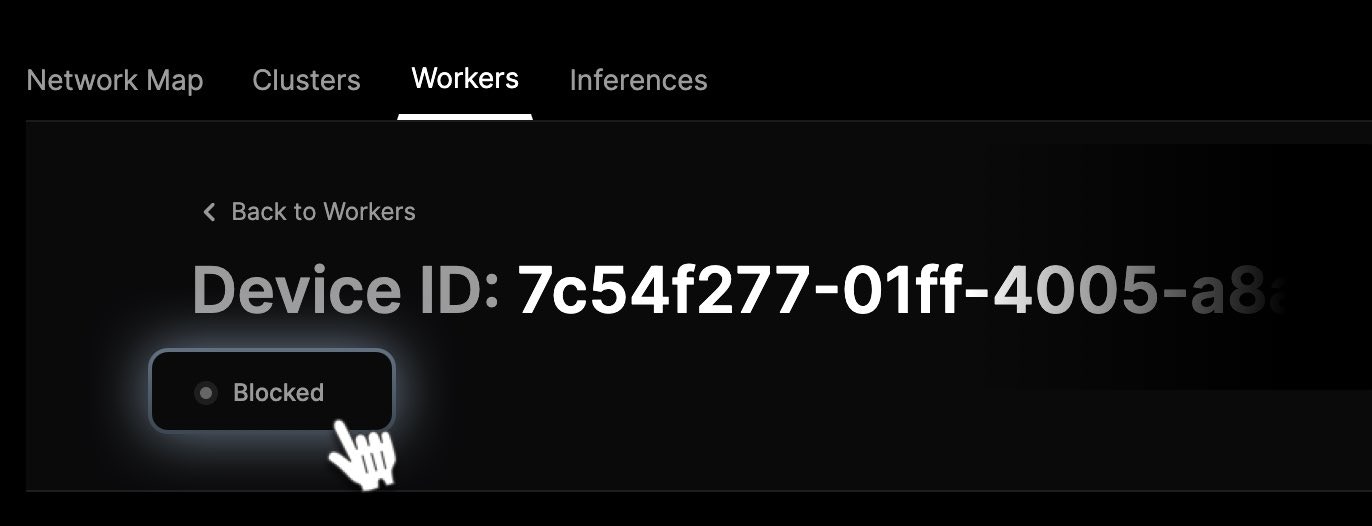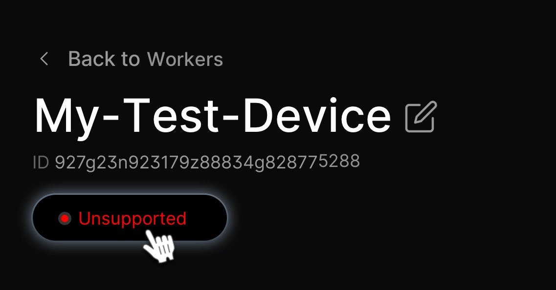 - Unsupported Hardware: If you successfully connected a new worker but the GPU/CPU you’re using is not supported, you won’t see your worker on the dashboard. You can check the list of supported devices here.