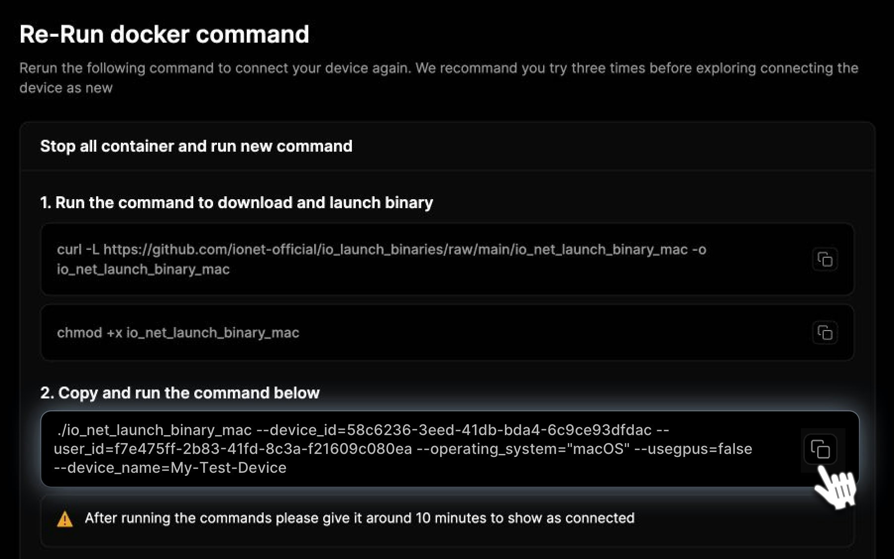 After restarting the device, open your Worker page at IO.NET and copy the command from the Re-Run docker command block on the Worker Page, then run it Terminal.