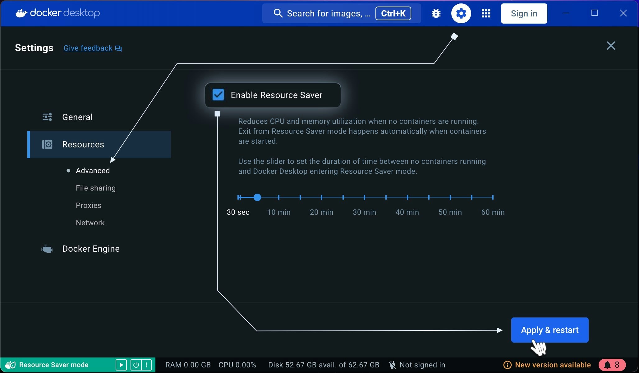 Ensure resources aren’t limited. Make sure Docker’s “Resource Saver” feature is disabled in the Resources tab of Docker Settings.