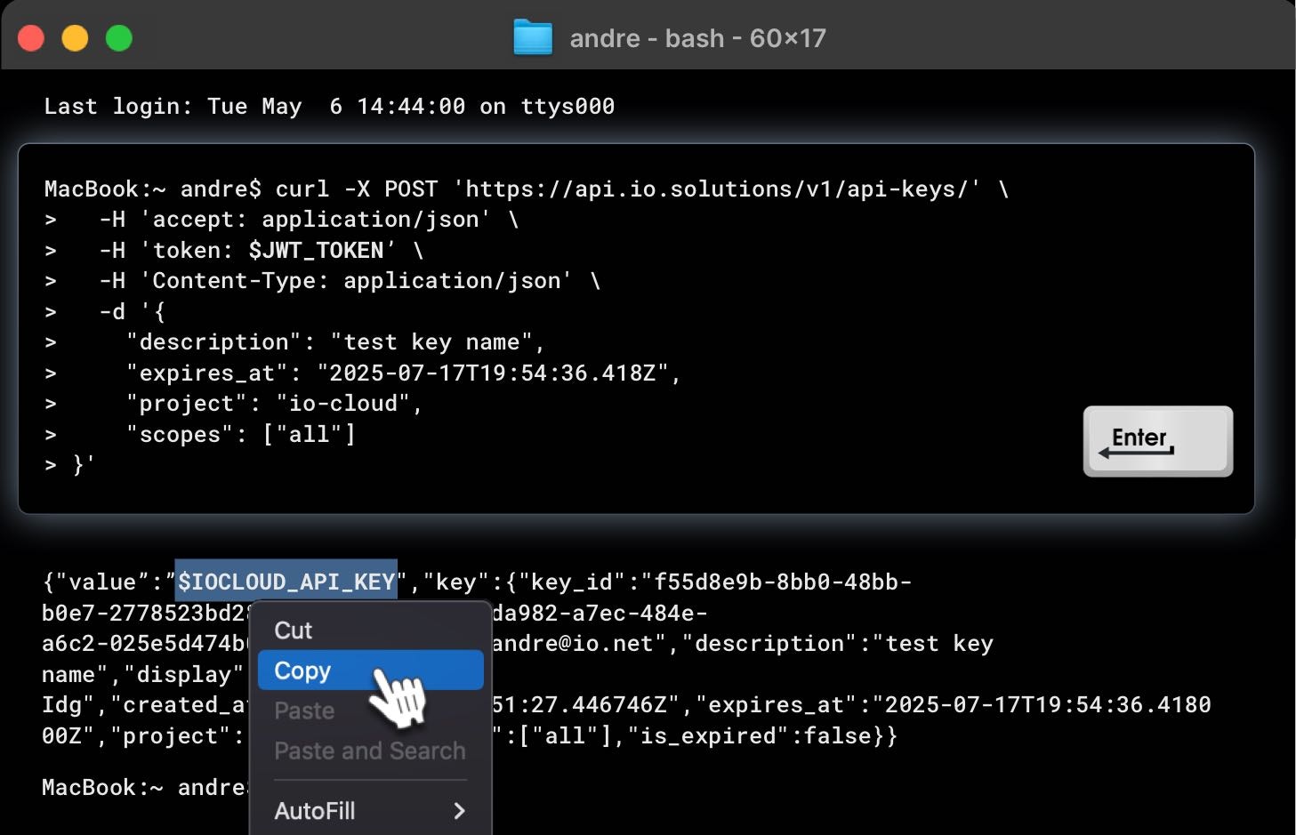 IO Clouds APIs authenticate requests using API keys. You can generate API keys from your user account. Note: When generating an API key, make sure to specify the associated IO Cloud project.Option 2: Generate an API Key Using a JWT Token